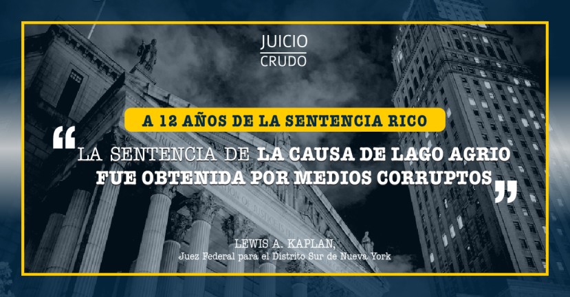 La decisión, tras un juicio de siete semanas bajo las leyes RICO contra el crimen organizado, fue dictada por el juez Lewis A. Kaplan en Nueva York. El juez Kaplan confirmó las prácticas corruptas usadas por los abogados y representantes de los demandantes de Lago Agrio para obtener la @@sentencia@@ de $9.500 millones contra Chevron.